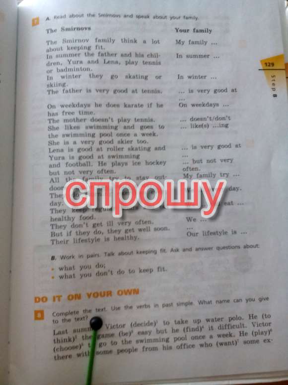 Семья Смирновых много думать о своей фигуре. Летом отец и его ребенок-ядрен, юна и Лена, поиграть в теннис или бадминтон. Зимой-покататься на коньках или лыжах. Отец очень хорошо играет в теннис, в будни он занимается карате, если у него есть свободное время. Мать не играет в теннис. Она любит плавать и ходит в бассейн раз в неделю. Она очень хорошая лыжница тоже. Лена хороша на роликовых коньках и Юра хорош на плавание и футбол. Он играет в хоккей, но не очень часто. Все семьи стараются держаться двери один или два часа в сутки. Они делают утреннюю гимнастику каждый день. И едят они держат регулярные часы здоровое питание. часто. Они не болеют очень хорошо. Но если они это сделают, они получат свой образ жизни здоровым. * преобразуй только*