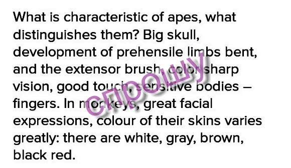 Какая характеристика у человекообразных обезьян, что отличает их большие скулы, развитые цепкие согнутые конечности, и сгибающаяся кисть, цветное острое зрение, хорошее касание,осязательные органы-пальцы.у обезьян величественное выражение лица. их цвет кожи сильно варьируется: белый, серый, коричневый, черно-красный.