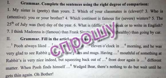 В первом задании нужно завершить предложения, используя правильную степень сравнения, а во втором дополнить предложения нужным артиклем (где это необходимо).