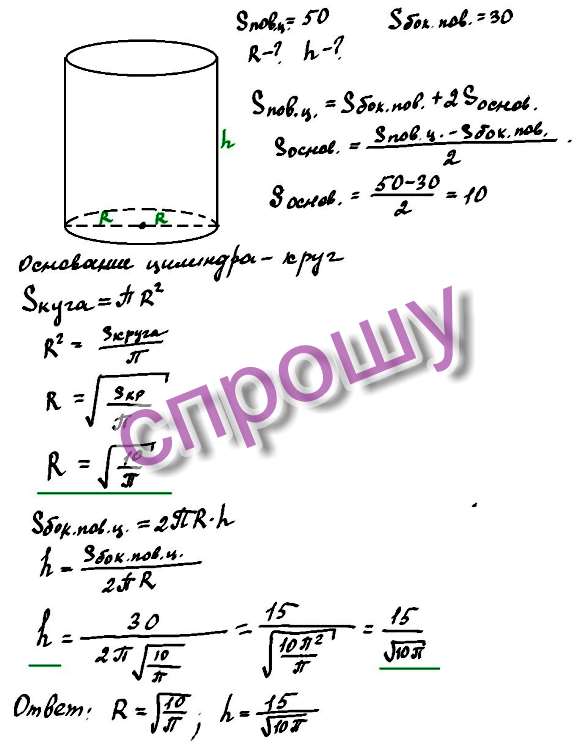 Площадь поверхности и площадь боковой поверхности цилиндра 50 и 30 см2. Найти радиус и высоту цилиндра.