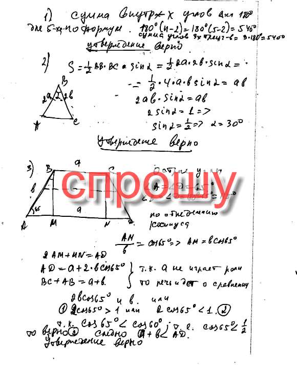 3) Если в равнобочной трапеции один из углов равен 65°, то сумма меньшего основания и боковой стороны меньше большего основания.