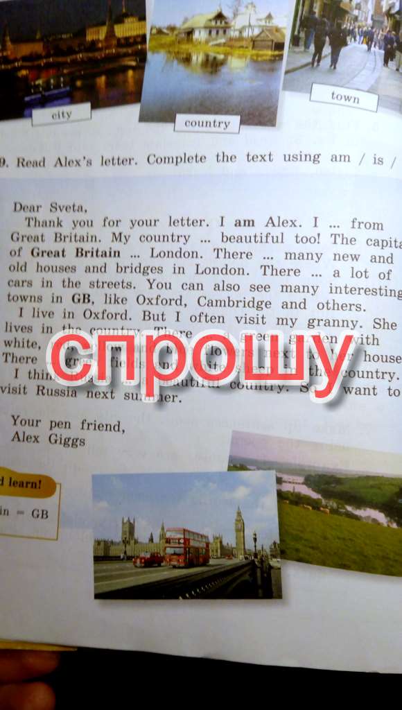 Спасибо за Ваше письмо. Я Алекс. Я из Великобритании. Моя страна тоже красивая! Столица Великобритании Лондон. Есть много новых и старых домов и мостов в Лондоне. Есть много машин на улицах. Вы также можете увидеть много интересных городов в Великобритании, как Оксфорд, Кембридж и другие.