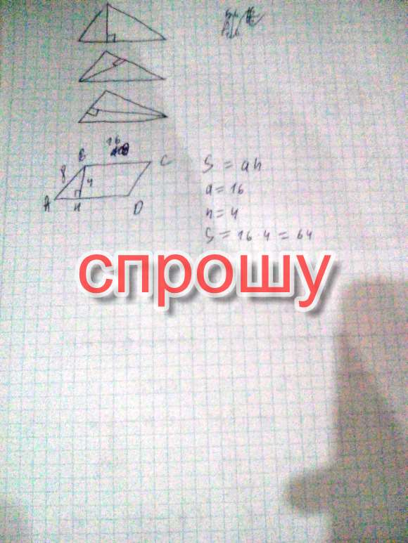 В параллелограмме ABCD сторона AB = 8 см, сторона BC = 16 см, а высота BH = 4см. Вычислите площадь пароллелограмма