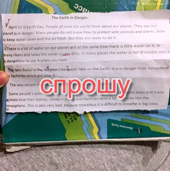 Земля в опасности. 22 апреля является Земля Dav. Люди во всем мире думают о нашей планете. Они говорят, что наша LANET находится в опасности. Многие люди не знают, как защитить диких животных и растений, как о держать воду чистой и воздух свежим. Но они готовы сделать это. Существует много воды на нашей планете и в то же время есть немного воды на нем. В любых реках и AKES вода очень грязная. Во многих местах вода не пригодна для питья, и это опасно использовать его, когда вы готовите. озеро Baikalisthe deepes fresihater iake на Земле это isindangernow, из-за электронных заводов, которые находятся рядом с ним. , Как люди живут есть сп RMD климата на нашей планете деятельность некоторых людей сделать много вреда лесам. Люди кошки вниз деревья и многие Mals теряют свои дома. Современные заводы и фабрики отправить много дыма в tmosphere. Это тоже очень плохо, потому что в наше время трудно дышать в крупных