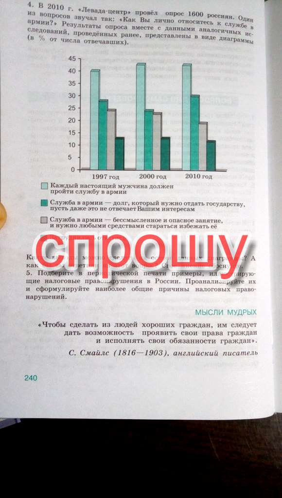 Сравнивая диаграммы за 1997, 2000 и 2010 годы можно отметить, что популярность идеи военной службы в армии увеличилось. Увеличилось количество людей в двух группах. Первая группа людей, как можно предположить, что это желающие послужить. Вторая группа - это люди, принимающие необходимость военной службы, хотя и не испытывающие большого желания служить. Количество людей, активно не желающих проходить военную службу уменьшилось.