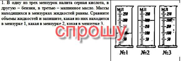 Массы находящихся в мензурках жидкостей равны . Запишите , в какую из них налито машинное масло, бензин , серная кислота