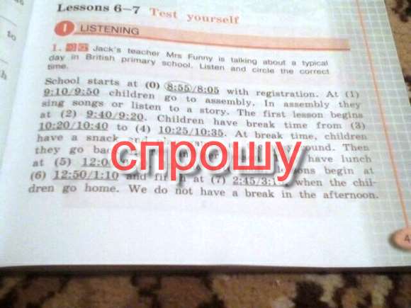 Школа начинается в 8 55 с регистрации.В 9 дети идут на собрание.Там они поют песни или слушают историю. Первый урок начинается в 9. У детей перерыв с 10 до 10. В перерыве они перекусывают и играют в игры в саду .Затем они возвращаются обратно на другой урок .Ланч у них в 12 .После обеда уроки начинаются в 12 и заканчиваются в 13 когда дети идут домой.У нас нет перерыва в обед.