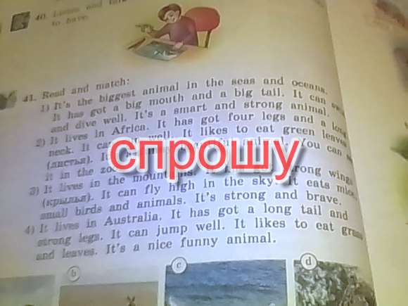 Read and match: in the keun and oc biggest animal and a big tail. s the big mouth and strong an # has got a Its n smart four legya and dive well. It got Africa. has and lives In It likes to eat You neck. It can run well. animal. Its a funny beautiful it in the zoo. 5) It lives in the mountains. It has got str win It can fly high in the sky. It eats rn (wings). Its strong and brave array birds and animals. got a long tail an Australia, It has 4) lives in well. It likes to eat strong legs. It can jump animal and leaves. Its a nice funny