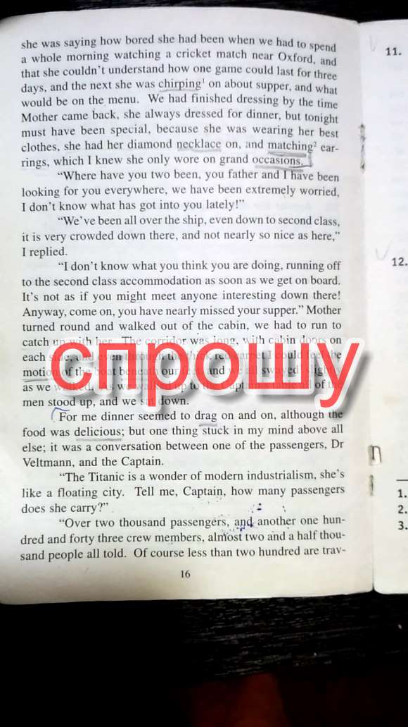 Она говорила, как скучно она была, когда мы должны были провести целое утро смотреть матч по крикету возле Оксфорд, что она не могла понять, как одна игра может продолжаться в течение трех дней, и следующая она была ч на поводу ужина, и что будет в меню. Мы закончили декорирование ВММ мать вернулась, она всегда одета на ужин, но tonigh должен быть особенным, потому что она была одета в свои лучшие одежды, она должна была ее бриллиантовое ожерелье на, и matching2 серьги, которые я знал, что она только носила по случаю торжественного Где вы были два, вы отец и Thave искал вас повсюду, мы были крайне обеспокоены, я не знаю, что попал в вас в последнее время! Мы были по всему кораблю, вплоть до второго класса. она очень тесно там, и далеко не так хорошо, как здесь я ответил. Я не знаю, что вы думаете, что вы делаете, убегал к жилым помещениям второго класса, как только мы получим на борту Это не так, если вы могли бы встретить кого-нибудь интересное там! Во всяком случае, давай, ты чуть не пропустил свой ужин. "Мать повернулась и вышла из каюты, мы должны были бежать, чтобы догнать ее. Коридор был длинный, с дверей кабины с каждой стороны, и даже через толстый красный ковер Icould чувствовать движение лодки под нашими ногами, и все мы слегка покачнулся, когда мы шли. Пока мы шли до капитана столом все мужчины встали, и мы сели для меня ужин, казалось, тащить дальше и дальше , хотя еда была вкусной, но одна вещь застрял в моем уме, прежде всего, это был разговор между одним из пассажиров, д-р Veltmann, и капитан "Титаник это чудо современного индустриализма, она как плавучий город. Скажите, капитан, сколько пассажиров делает она носить "Более двух тысяч пассажиров, а другой Hun Dred и сорока трех членов экипажа, почти два с половиной тысяча людей все сказали. Конечно, менее двухсот являются Trav