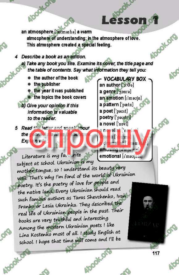 Литература - мой любимый урок в школе. Украинский - мой родной язык, поэтому я хорошо понимаю всю красоту этого языка. Именно поэтому я очень люблю украинскую поэзию. Это стихи о любви к людям и родной земле. Каждый украинец должен читать таких известных писателей, как Тарас Шевченко, Иван Франко и Леся Украинка. Они описывали реальную жизнь на Украине в прошлом. Их книги по-настоящему реалистичны и интересны. Из современных украинских поэтов мне больше всего нравится Лина Костенко. В школе я учу английский. Надеюсь, время придёт и я... (на этом текст обрывается)