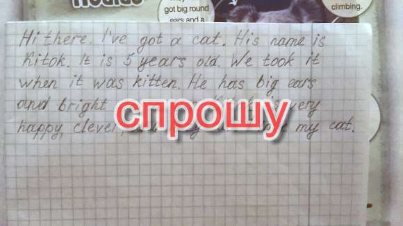 Хай зээр. Айв гот э кэт. Хиз нэйм из Киток. Ит из файв иарз олд. Хи хэз биг иарз энд брайт грин айзыз.Киток из вэри хэппи , клэвэр энд лэйзи кэт. Ай лав май кэт.