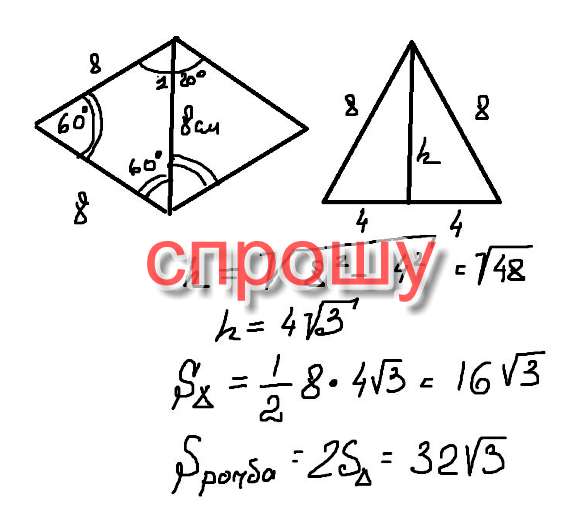 Острый угол ромба равен 60 градусов. Длина меньшей диагонали ромба 8см. Найдите площадь ромба. только без синусов и всего такого.