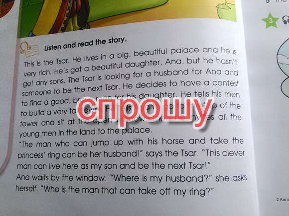 Это Царь. Он живет в большом, красивом дворце и оночень богат. У него есть красивая дочь Анна, но нет у него сыновей. Царь ищет мужа для Анны, человекакоторый в будущем станет новым царем. Он решает устроить соревнование, чтобы найти хоро-шего, смелого мужчину для своей дочери. Он приказываетсвоим слугам построить очень высокую башню. Он проситАнну подняться на верх башни и сидеть перед открытым окном. Затем он приглашает всех молодых людей страны водворец. "Человек который может прыгнуть на коне и снять кольцо с руки принцессы, станет её мужем" -- сказал Царь. "Этот ловкий человек будет жить во дворце и станет мне сыном. Он будет следующим царём". Анна ждет у окна. "Где мой муж" -- спрашивает она себя. "Кто тот мужчина что сможет достать кольцо".