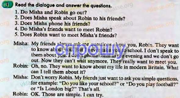 Миша: Не беспокойся Робин. Мои друзья хотят спросить тебя только простые вопросы. Например, Ты любишь свою школу или ты играешь в футбол или Лондон большой Это всё.