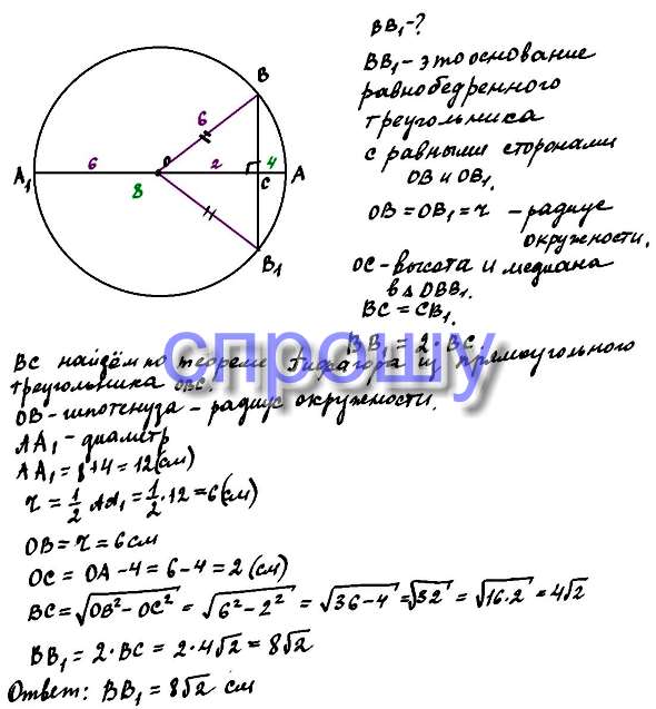 Диаметр окружности AA1 перпендикулярен хорда BB1 и пересекает ее в точке C.Найдите BB1 , если AC = 4 см,CA1 = 8 см.