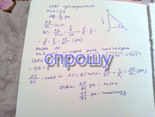 Известны катеты прямоугольного треугольника 5/7 дм и синус 0,6 протеволежащего ему угла. Найдите гипотенузу и неизвестный катет этого треугольника