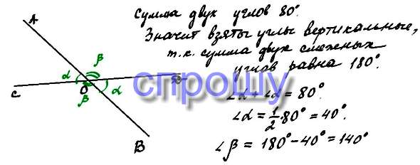 Сумма двух углов из четырех полученных при пересечении двух прямых равна 80*.найдите один из двух других углов