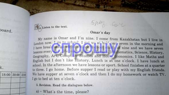 Привет я Омар ,мне 9. Я из Казахстана но сейчас живу в Лондоне. Я хожу в школу. Я просыпаюсь в пол 8 утра и завтракаю в 8 Школа начинает работать с 9 и у нас 7 уроков каждый день. Мы учим английский, французский, математику