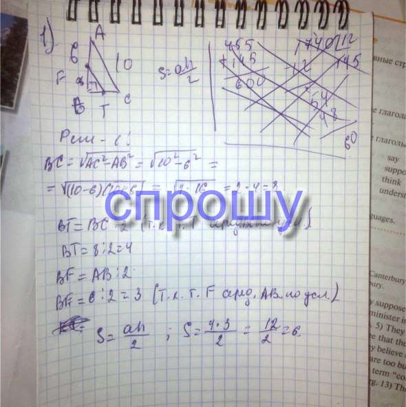 1)В прямоугольном треугольнике ABC (угол ABC = 90градусов) AB = 6см , АС = 10см.Точки F и T середины сторон AB и BC соответственно.Вычислите площадь треугольника ВFT.