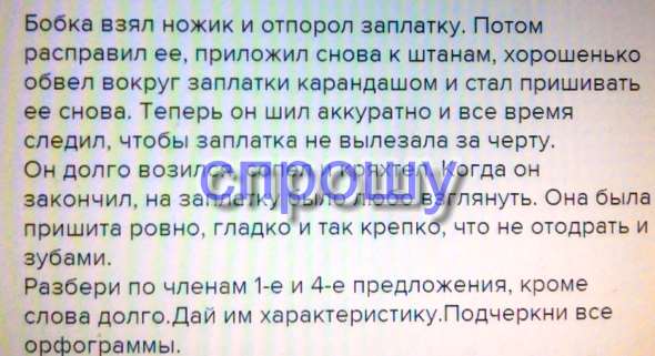 Бобка(сущ.) взял (гл.) ножик (дополнение,сущ.) и (предлог) отпорол(тоже гл.) заплатку (дополнение сущ.)