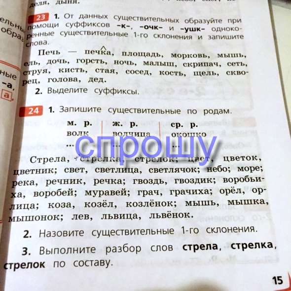 Стрела(ж.р), стрелка (ж. р), стрелок (м. р), цвет (м. р) цветок (м. р), цветник (м. р) свет(м.р), светлтца (ж. р), светлячок ( м. р), небо (ср. р) , море(ср.р) ,река (ж. р) речник ( м. р) речка (ж. р) гвоздь (м. р) гвоздик (м. р)