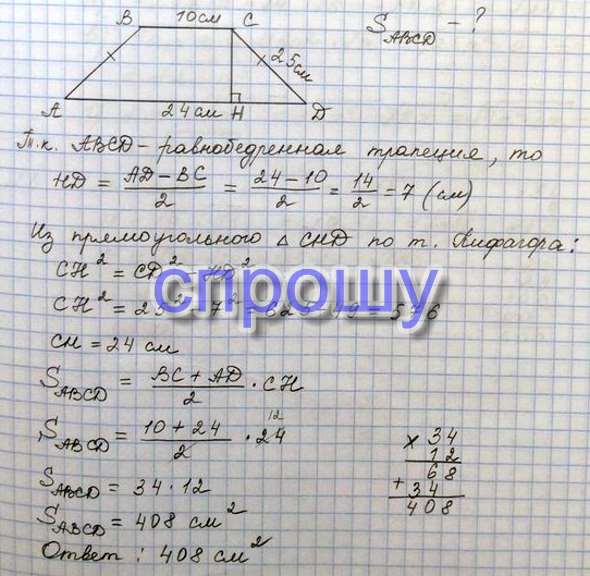 Основания трапеции равны 10 см и 35см , боковые стороны равны 7 см и 24 найдите площадь трапеции