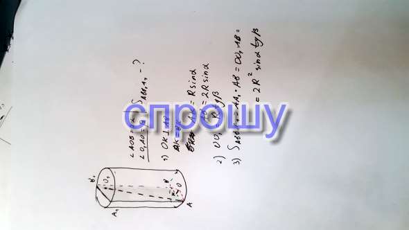 В цилиндре с основанием радиуса R параллельно его оси проведена плоскость. Она пересекает нижнюю основу по хорде, которая видна из центра этой основе под углом 2А(альфа). Отрезок, соединяющий центр верхнего основания цилиндра с точкой окружности нижнего основания образует с плоскостью основания угол В(бета). Определите площадь сечения