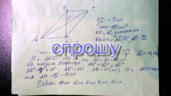 Одни из диагоналей параллелограмма является его высотой и равна 9 см. Найдите стороны этого параллелограмма, если его площадь равна 108 квадратных сантиметров