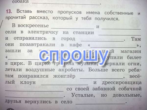 В воскресенье МИША и ВАСЯ сели в электричку на станцие БУЛОЧНАЯ и отправились в город МОСКВА.там они позавтракали в кафе БЕРЁЗКА и зашли за покупками в спортивный магазин СПОРТИК.и ,наконец ,купили билет в цирк.в цирке гремела музыка,сверкали огни, летали воздушные акробаты.больше всего ребятам понравился жонглёр ДМИТРИЙ,весёлый клоун МАКС и дрессировщица ЮЛЯ со своей забавной собачкой ЧАРЛОЙ . усталые ,но довольные, друзья вернулись в село УСПЕНСКОЕ.