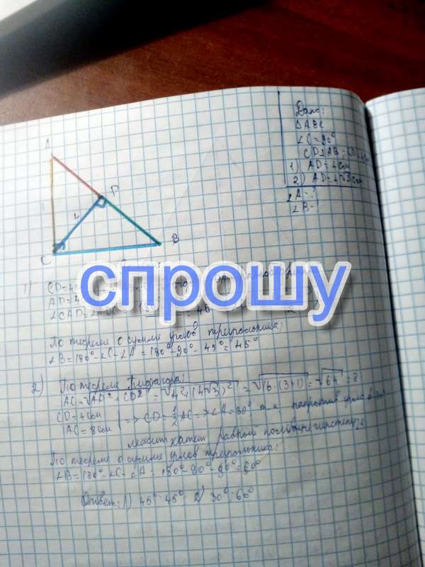 Значит, CD = 1/2AC =gt; ∠A = 30°, т.к. напротив угла в 30° лежит катет, равный половине гипотенузе.