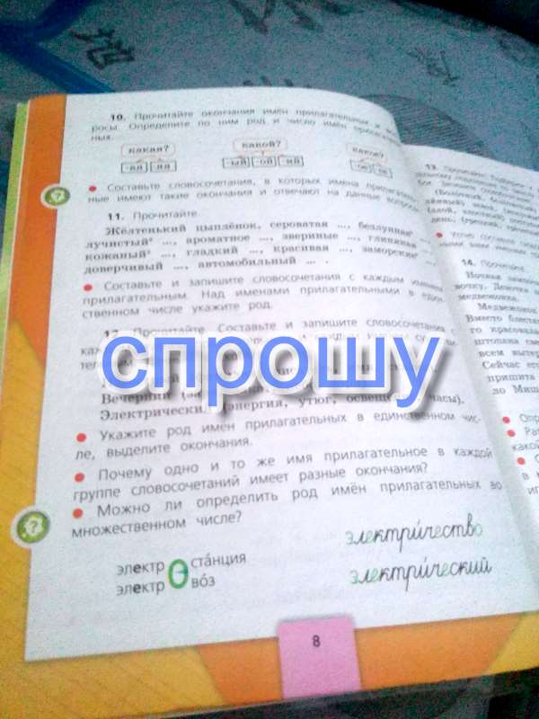 Упр. 11. Жёлтенький цыплёнок, сероватая кошка, безлунная ночь, лучистый свет, ароматное каланхоэ, звериные следы, глиняная статуя, кожаный стул, гладкий щенок, красивая девочка, заморские икры, доверчивый ребёнок, автомобильный салон