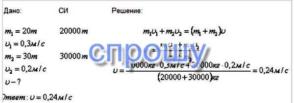 Вагон массой 30 т, движущийся со скоростью 0.3 м/с, нагоняет вагон массой 35 т, движущийся со скоростью 0.2 м/с. Какова скорость вагонов после взаимодействия, если удар неупругий?