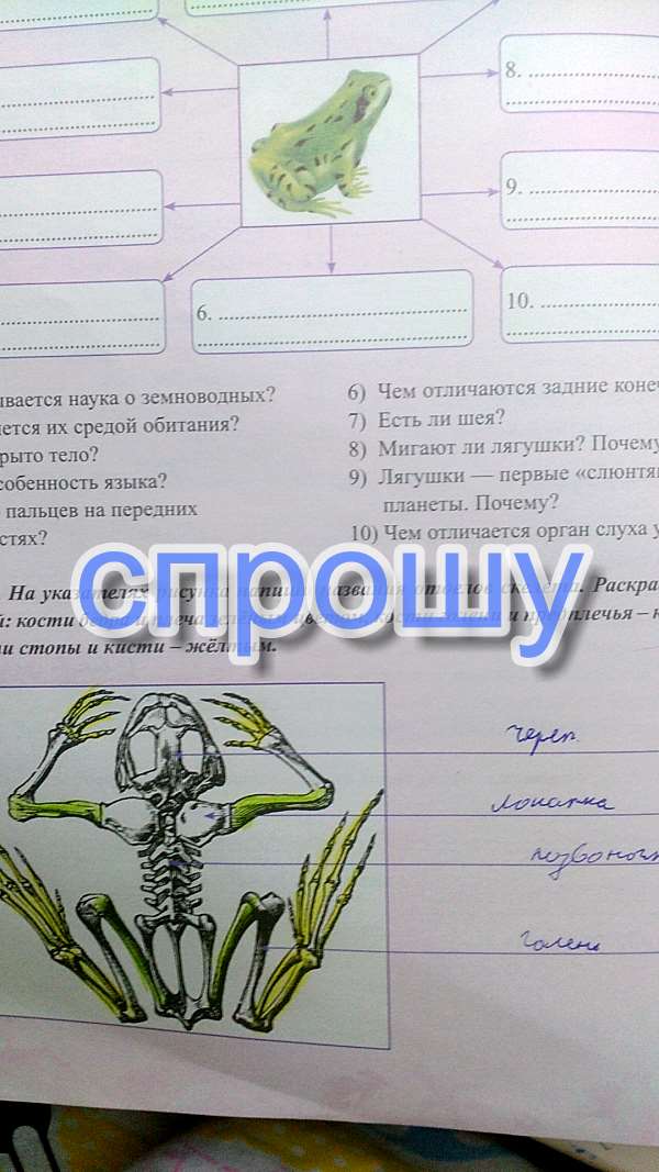 Ответив на вопросы,заполни схему с характерными признаками земноводных на примере лягушки
