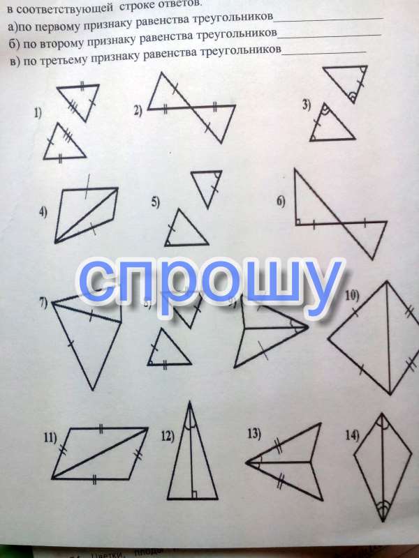 На рисунках,треугольники равны по одному из признаков равенства треугольников.Запишите номера в каждую строку.Рис.внизу.
