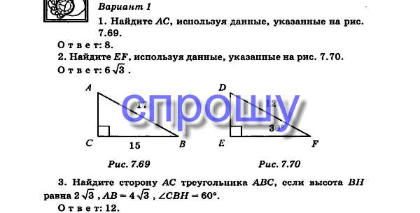 1.по т.Пифагора АВ^2=АС^2+ВС^2,откуда АС^2=АВ^2-ВС^2