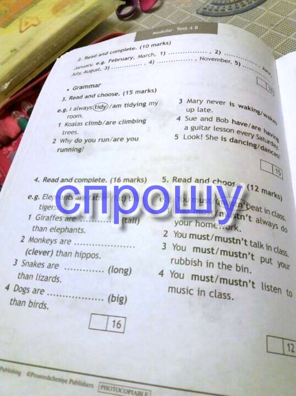 Привет! 2.April,May,September,October,December. 3. climb,are you running,wakes up,have,is dancing. 4. taller,more clever,longer,bigger. 5. must,mustnt,must,mustnt. Успехов!