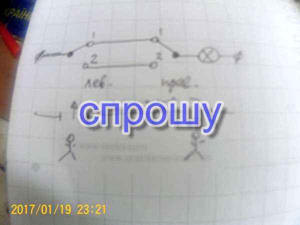 Вход слева-человек зашёл включил свет.Прошёл по корридору выключил правый выкл.-вышел.