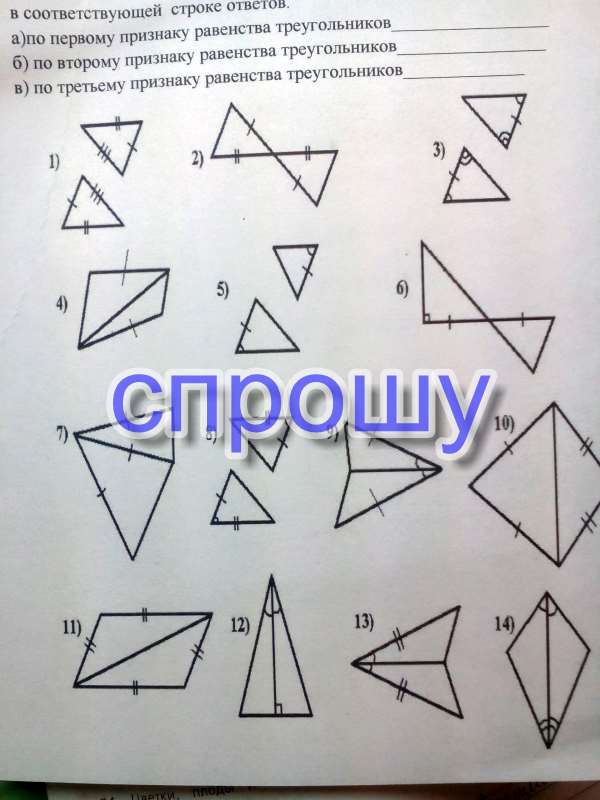 На рисунках,треугольники равны по одному из признаков равенства треугольников.Запишите номера в каждую строку.Рис.внизу.
