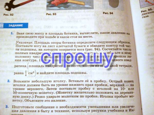 F давл. будет равна силе тяжести, т.е. mg(она будет немного изменяться при ходьбе, т.к. там присутствуют ускорение, инерция и т.д., но нам это не нужно). Площадь стоя на месте будет равна площади двух стоп, т.е. 549+46/2 = 549+23 = 572 квадратика. Я очень надеюсь, что один квадратик у тебя равен 1 см квадратному, тогда s стоя = 572 см кв. = 0,0572 м кв. При ходьбе площадь будет равна площади одной стопы, т.е. s ходьбы = s стоя/2 = 0,0286 м кв. Вычислим давления: