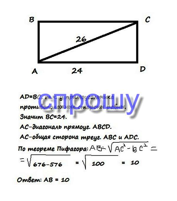 В прямоугольнике ABCD найдите AB, если AC = 26, AD = 24