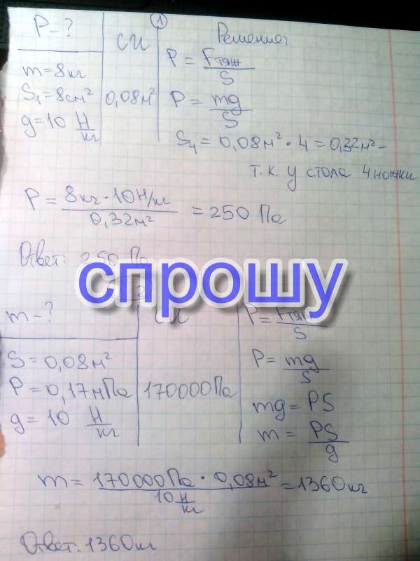 1. Какое давление на пол оказывает стол массой 8 кг, если площадь одной ножки 8 см(в квадрате)