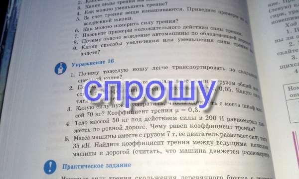 Сила трения вычисляется по формуле: Fтрения=mN , где сила трения это произведение коэффицента трения мю и силы реакции опоры эн.
