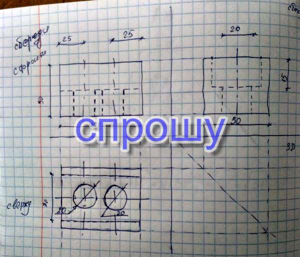 Основание представляет собой параллелепипед. По центру верхней (наибольшей) плоскости параллелепипеда, вдоль ее длинной стороны, проходит паз призматической формы. В пазу имеются два сквозных цилиндрических отверстия. Центры отверстий отстоят от торцов детали на расстоянии 25 мм.