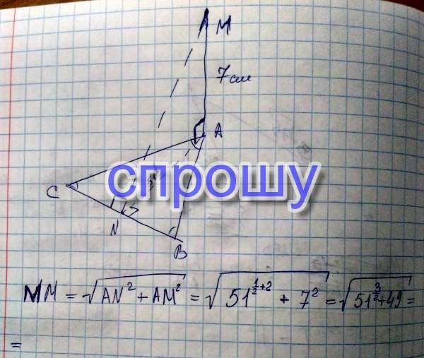 Из вершины правильного треугольника ABC к его плоскости восстановлен перпендикуляр АМ, АМ = 7см. Найти расстояние от точки М до стороны ВС если высота треугольника АВС равна 51^1/2