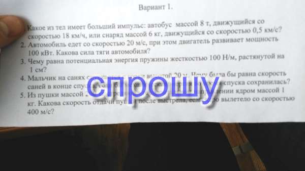 5) m1*V1=m2*V2 V2=m1*V1/m2=1*400/200=2 м/с