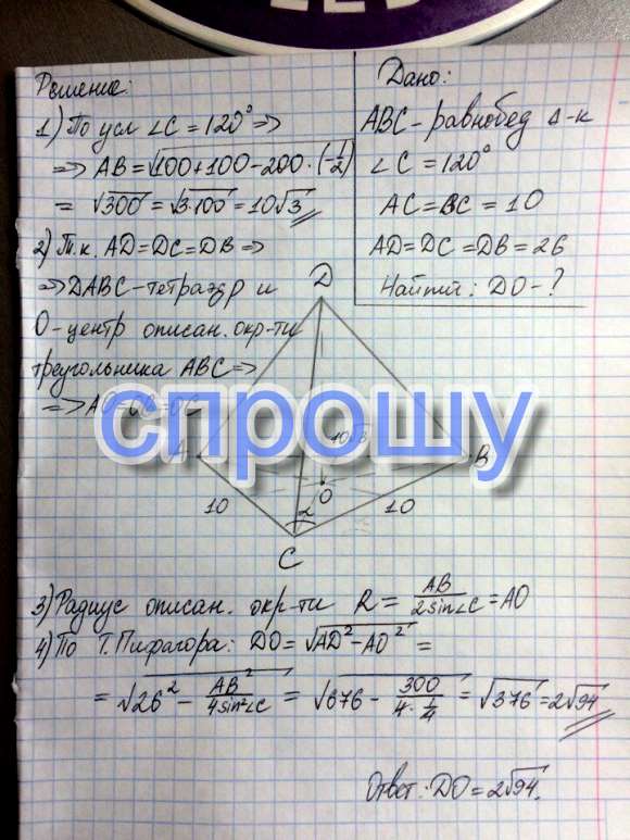 Угол при вершине равнобедренного треугольника равен 120 градусов, боковая сторона - 10 см. Вне полоски треугольника дана точка удаленная от всех его вершина 26 см. Выясните расстояние от этой точки до плоскости треугольника