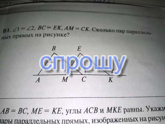 Угол 1 = углу 2,ВС = ЕК,АМ = СК.Сколько пар параллельных прямых на рисунке?