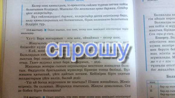Бара жатырмын- осы шақ, ойнаймыз - келер шақ, жүр - осы шақ, күтіп жүр - осы шақ, демаламыз - келер шақ, күтіп отыр - осы шақ, жинаймыз - келер шақ, шығамыз - келер шақ, ән саламыз- келер шақ, өсіреміз - келер шақ.