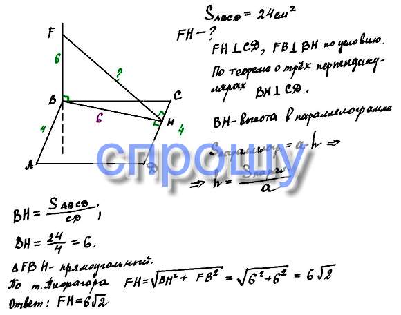 Дан параллелограмм АВСD, площадь которого 24см*2. Через вершину В проведена прямая ВF, перпендикулярно плоскости АВС. Найдите расстояние от точки F допрямой CD, если сторона параллелограмма СD 4см, а расстояние от точки F до плоскости АВС 6 см.