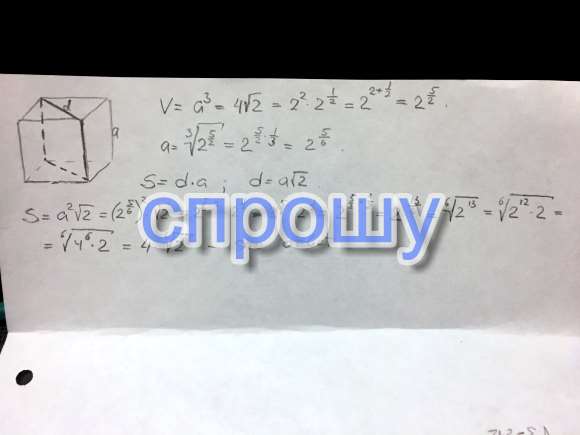 Найдите площадь диагонального сечения куба.Если его объем равен 4 корня из 2